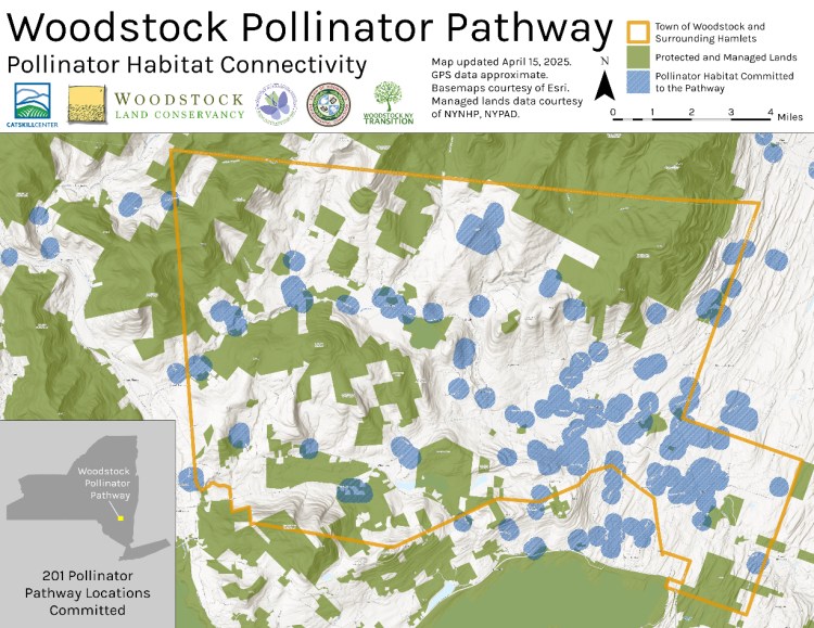 The map shows the pollinator areas created by people who have joined the Woodstock, NY Pollinator Pathway. We hope to have pollinator gardens as close together as possible so that pollinators can fly easily from one to another. So, encourage your neighbors to create pollinator habitat and join the pathway!